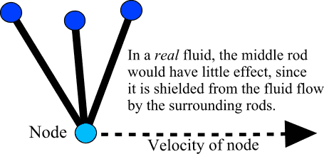 Basic modelThe nodes are considered to be point masses (and are not directly affected by the fluid), and the rods are considered to be in motion through a stationary liquid.The liquid offers least resistance to the motion when a node is moving through the fluid in the same direction as the attached rod. It offers most resistance when the rod is perpendicular to the direction of motion. The force applied to a node by a rod depends on three factors: