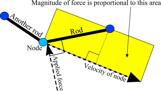 This is calculated by computing a unit vector normal to the velocity of the node, and applying a dot product between this and the rod. The resulting force is applied at right angles to the rod. No force is ever applied along the rod - the rod may always more freely in this direction. Hopefully a diagram will help at this point: